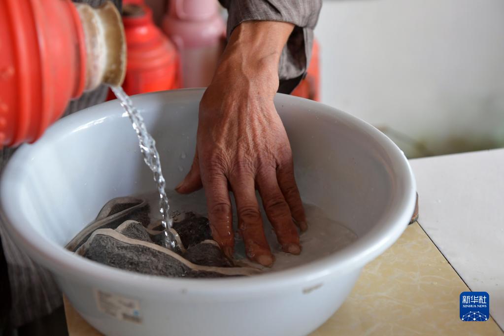 在江西省南昌縣三江鎮徐羅村,羅安民用手試水溫,準備給老伴擦洗身體(9月5日攝)。
