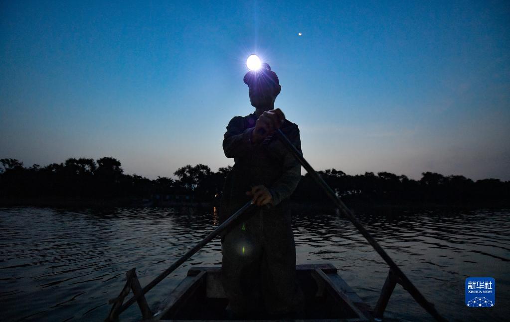 清晨,小辛碼頭村村民在潮白河上捕魚(yú),為該村農家院提供菜品原料(9月3日攝)。新華社記者 孫凡越 攝