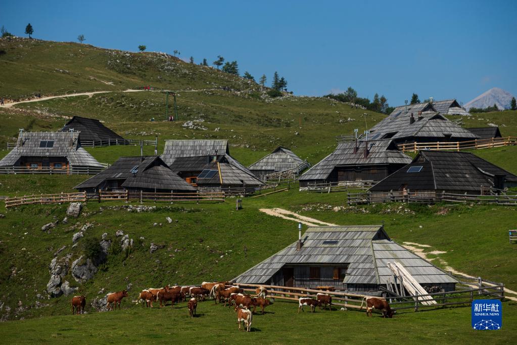 這是9月8日在斯洛文尼亞維利卡普拉尼那高地牧民定居點(diǎn)拍攝的傳統木屋和奶牛。