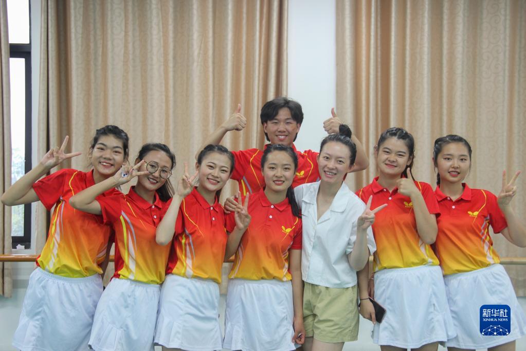 鄧蕓虹(右三)和聽(tīng)障大學(xué)生舞蹈團的部分學(xué)生在演出后合影(6月30日攝)。