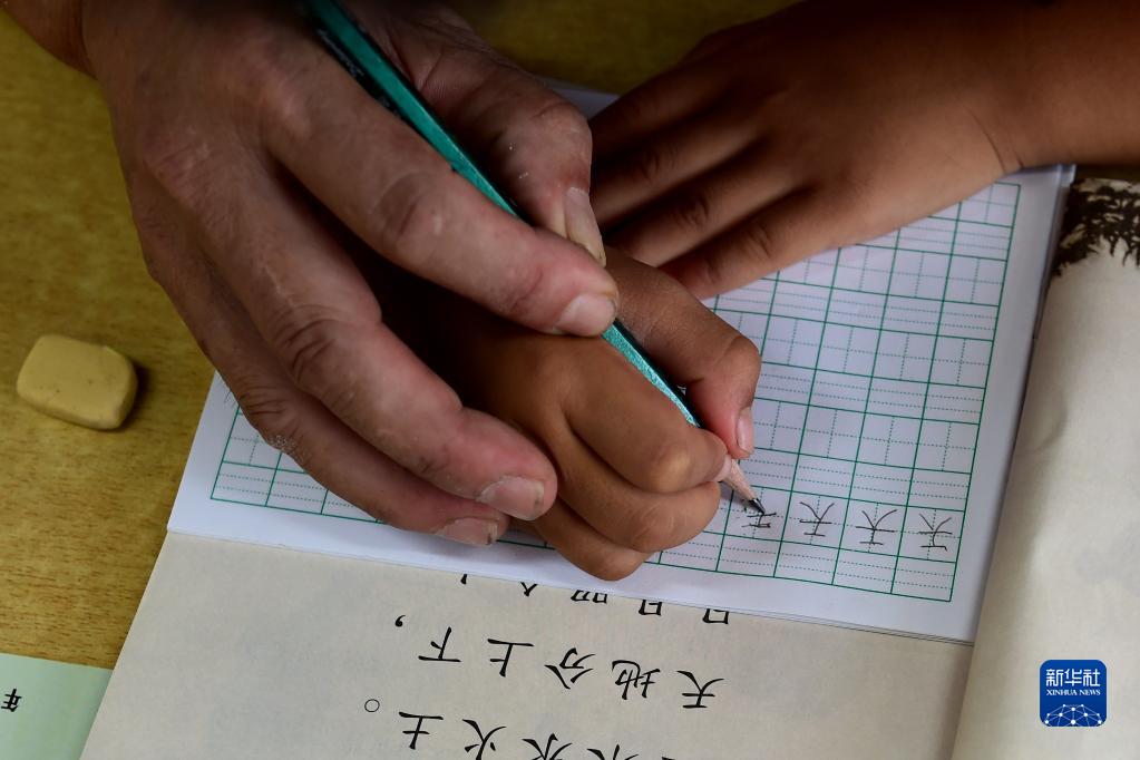 在菥荻教學(xué)點(diǎn),許新民教一年級學(xué)生朱心怡寫(xiě)字(9月1日攝)。