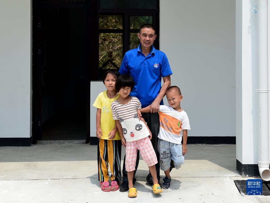 在菥荻教學(xué)點(diǎn),許新民和三名學(xué)生在教室前合影(9月1日攝)。