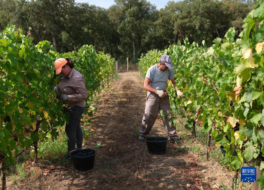 9月9日,在法國南部濱海阿爾卑斯省的芒德略拉納普勒,果農采摘用來(lái)釀酒的葡萄。