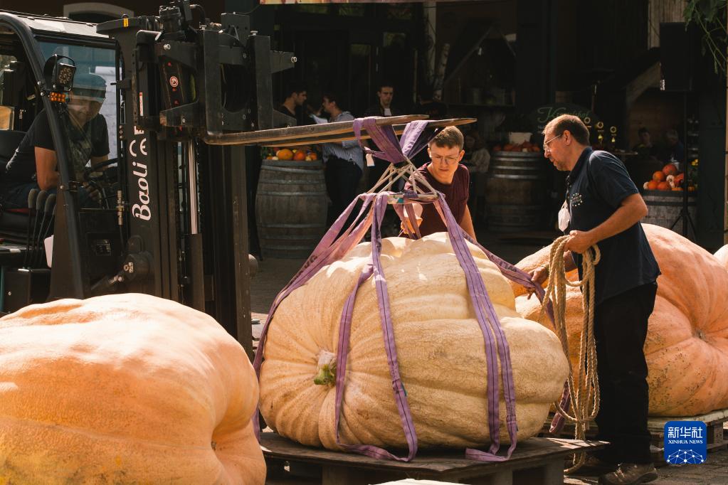 9月12日,在德國洛馬爾傳統南瓜節上,工作人員用鏟車(chē)給一個(gè)南瓜稱(chēng)重。