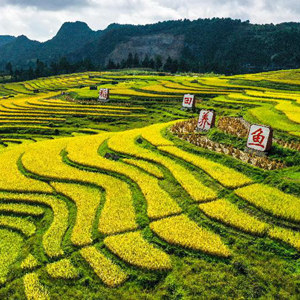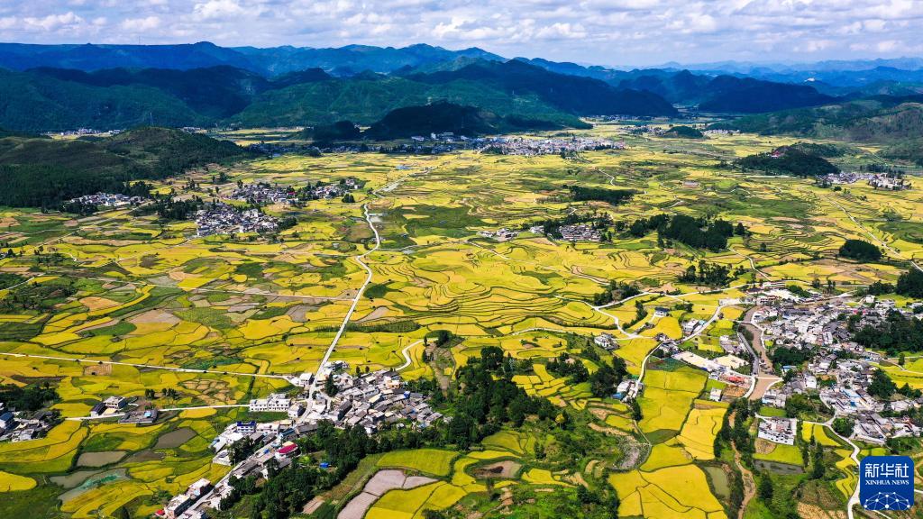 連日來(lái),貴州省黔南布依族苗族自治州龍里縣灣灘河鎮天氣晴好。水稻成熟,田野鍍金,農民搶收稻谷,一片豐收景象。