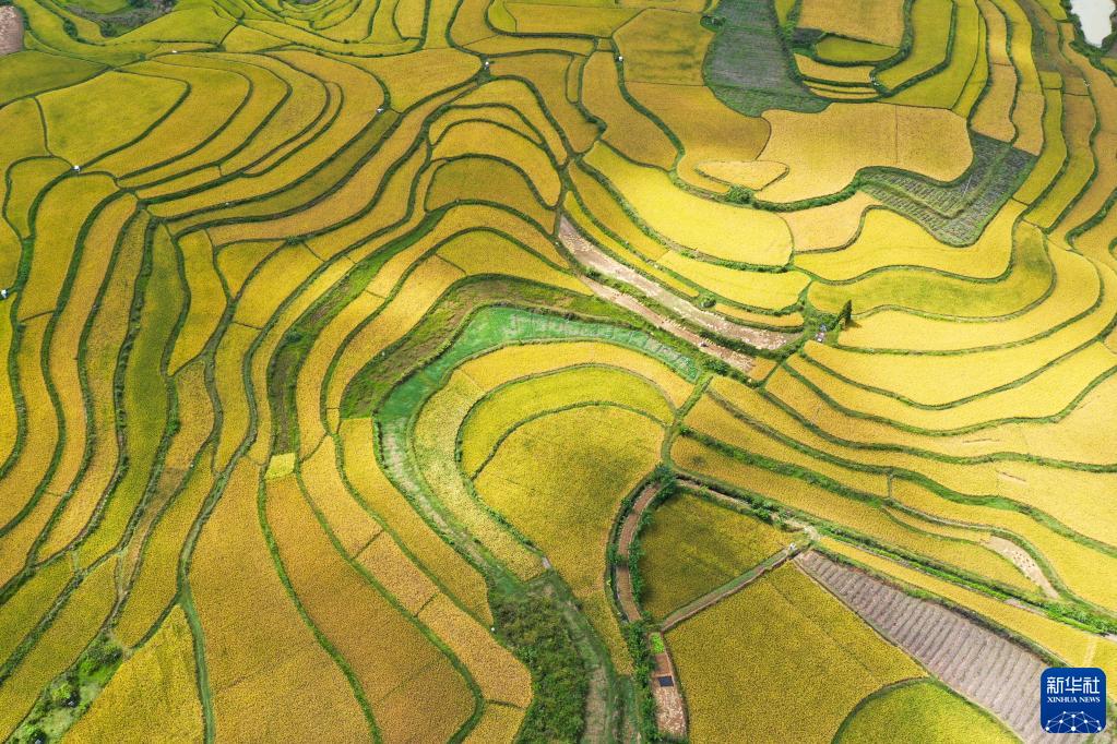 連日來(lái),貴州省黔南布依族苗族自治州龍里縣灣灘河鎮天氣晴好。水稻成熟,田野鍍金,農民搶收稻谷,一片豐收景象。