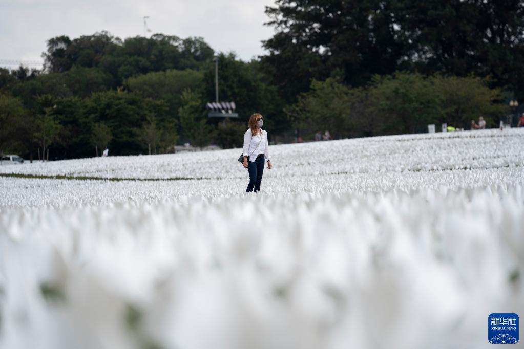 9月16日,在美國首都華盛頓,一名女子從草坪上的白色旗幟旁走過(guò)。