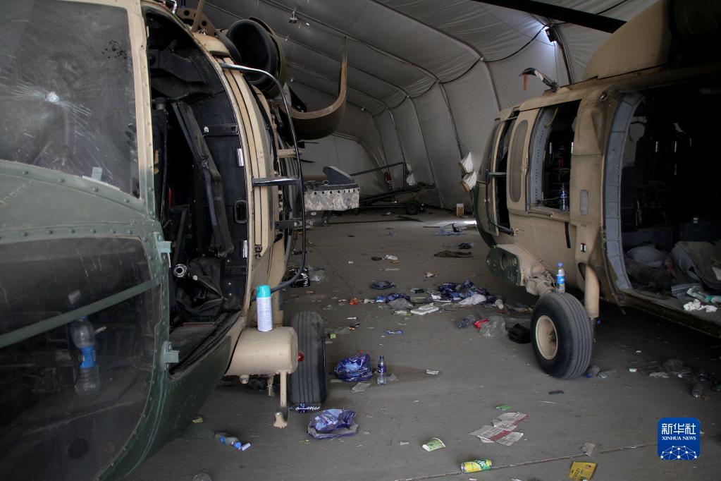 這是9月20日在阿富汗喀布爾機場(chǎng)拍攝的被毀壞的阿富汗空軍直升機。