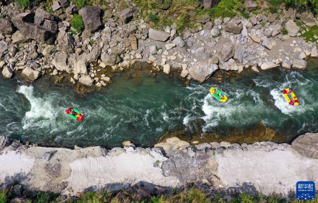 10月2日,游客在貴陽(yáng)市開(kāi)陽(yáng)縣南江大峽谷景區體驗漂流(無(wú)人機照片)。