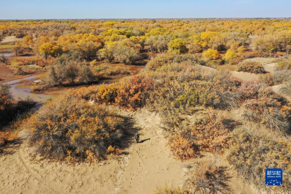 10月11日,護林員魏存廣在額濟納旗七道橋胡楊林區巡護(無(wú)人機照片)。新華社記者 劉磊 攝