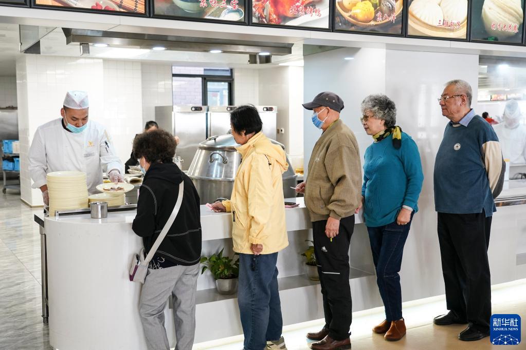 10月12日,在位于河北燕郊的燕達金色年華健康養護中心餐廳內,呂偉業(yè)(右一)和老伴兒李戰平(左)與其他老人在排隊取餐。