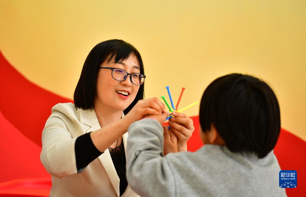 10月13日,張余敏(左)在海興縣特教學(xué)校精細動(dòng)作康復室內和學(xué)生做游戲。