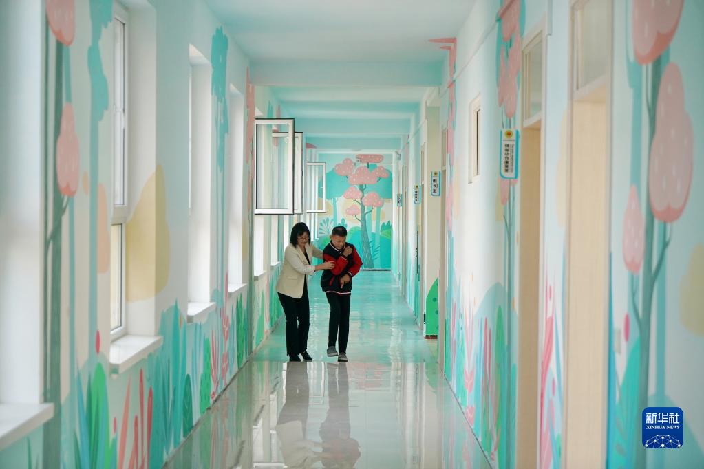 10月13日,張余敏(左)在海興縣特教學(xué)校內攙扶一名學(xué)生行走。