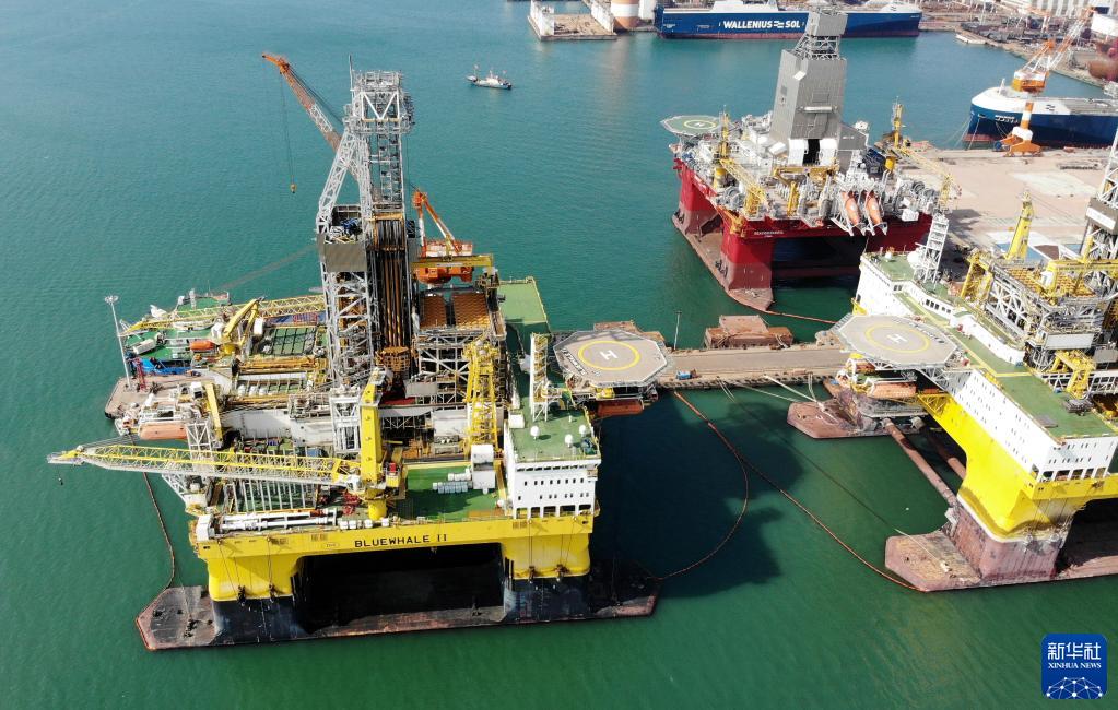 “藍鯨1號”(前右)及姊妹平臺“藍鯨2號”正在其生產(chǎn)基地中集來(lái)福士海洋工程有限公司煙臺基地進(jìn)行維護和保養(10月18日攝,無(wú)人機照片)。