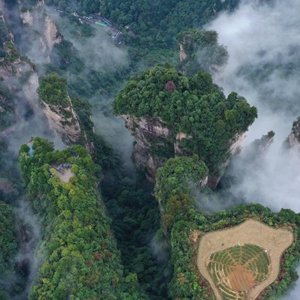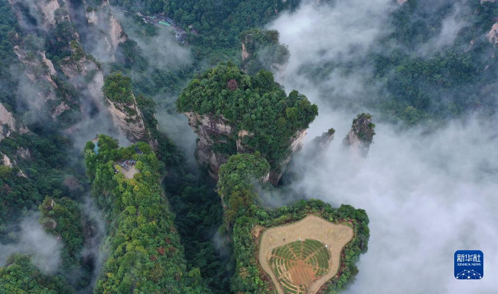 當日,雨后的湖南張家界武陵源,云霧飄蕩在峰林之間,若隱若現,美不勝收(無(wú)人機照片)。新華社發(fā)(吳勇兵 攝)