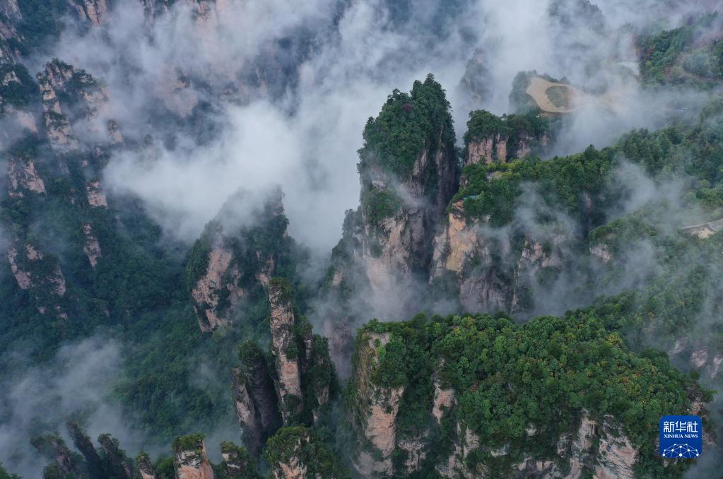 當日,雨后的湖南張家界武陵源,云霧飄蕩在峰林之間,若隱若現,美不勝收(無(wú)人機照片)。新華社發(fā)(吳勇兵 攝)