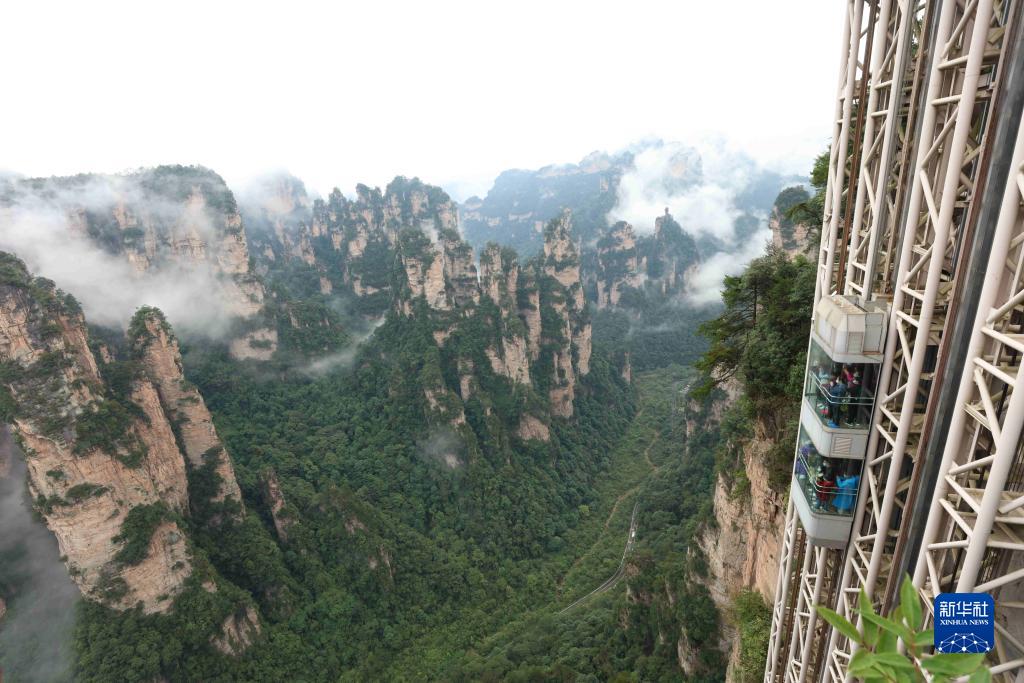 10月19日,游人乘坐百龍天梯欣賞峰林美景。