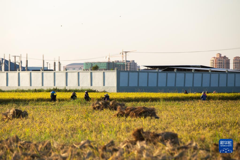 10月25日,農民在老撾萬(wàn)象城邊的田地里收割稻谷。
