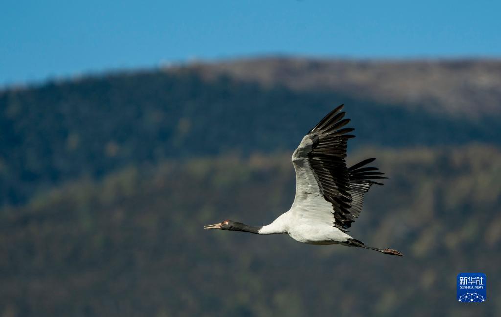10月29日,黑頸鶴飛翔在納帕海上空。