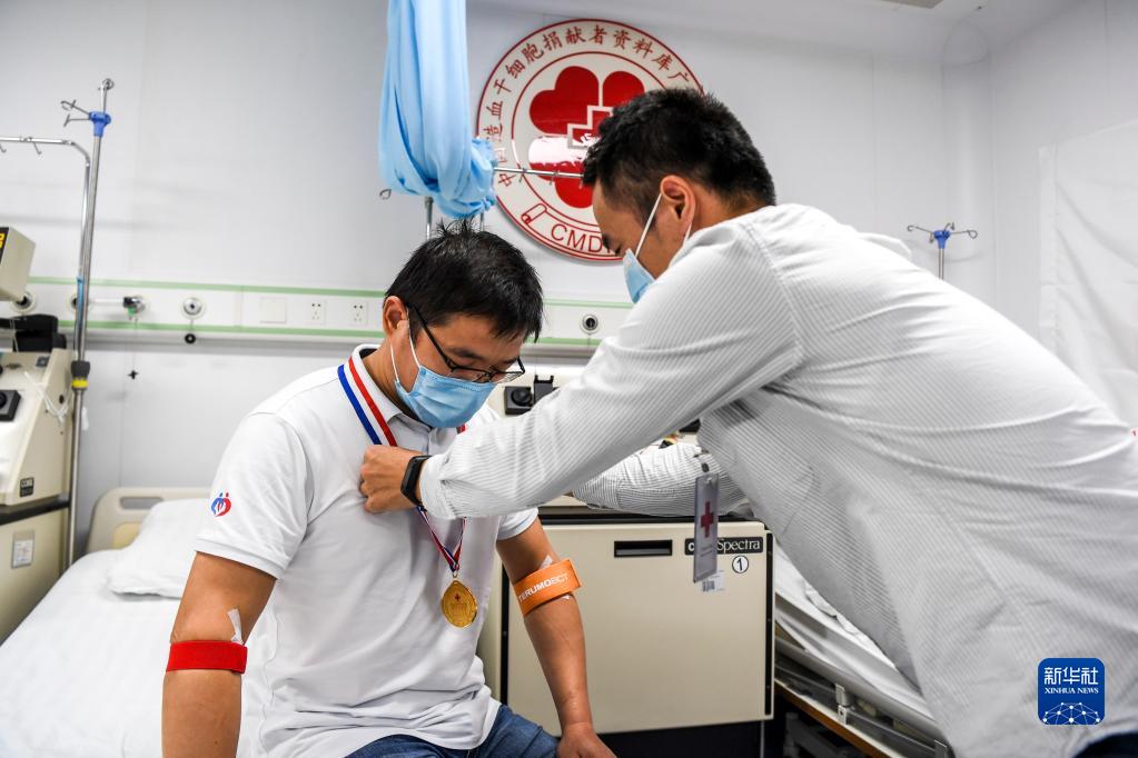 在廣西醫科大學(xué)第一附屬醫院,工作人員為造血干細胞捐獻者李醫生(左)戴上獎?wù)拢?021年11月攝)。