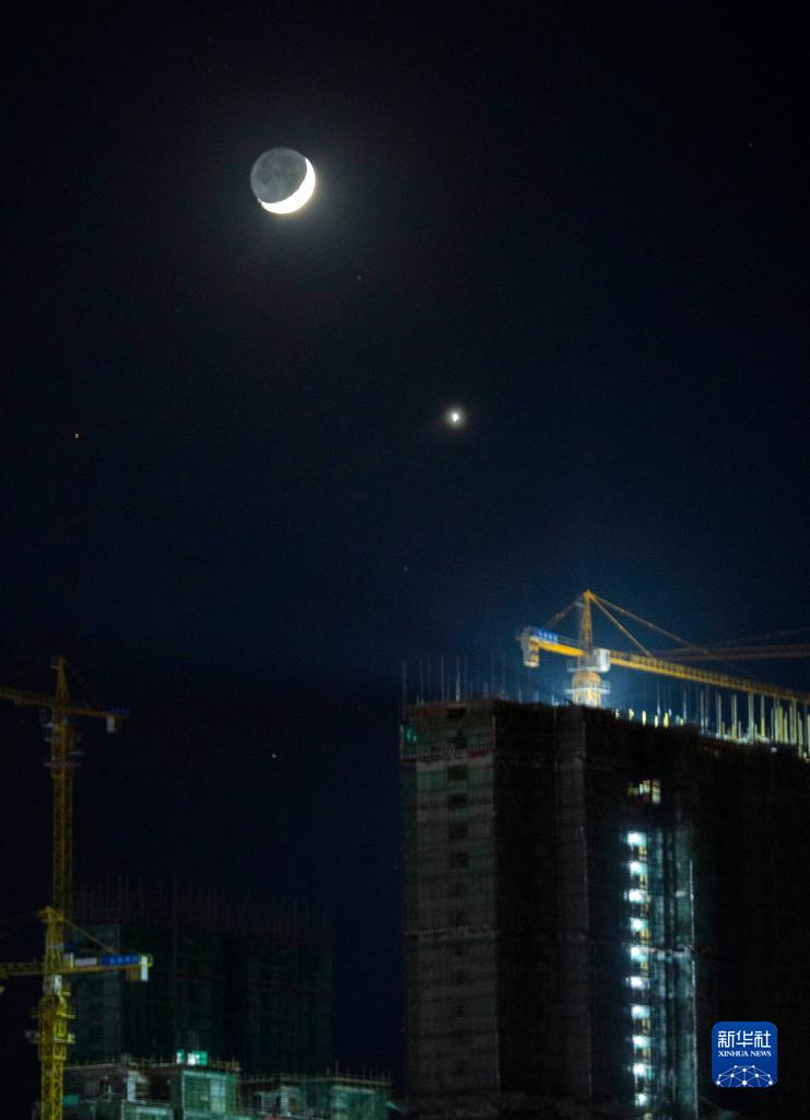 11月8日傍晚在江西省九江市都昌縣拍攝的金星合月景觀(guān),金星和月球在天空相互呼應,格外醒目。