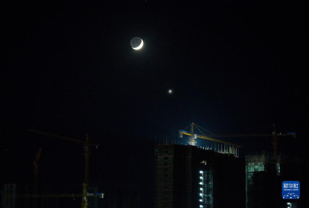 11月8日傍晚在江西省九江市都昌縣拍攝的金星合月景觀(guān),金星和月球在天空相互呼應,格外醒目。