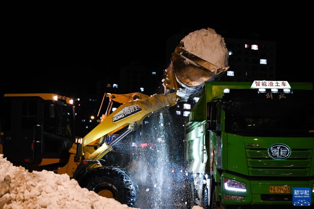 11月11日晚,在通遼市城區,作業(yè)車(chē)輛連夜清理積雪。