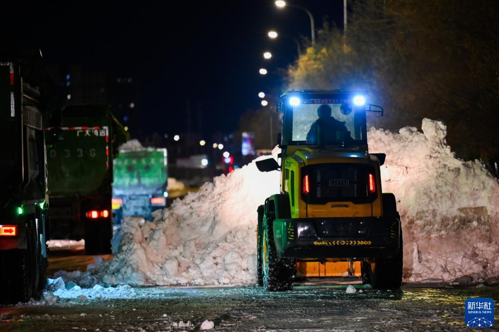 11月11日晚,在通遼市城區,作業(yè)車(chē)輛連夜清理積雪。