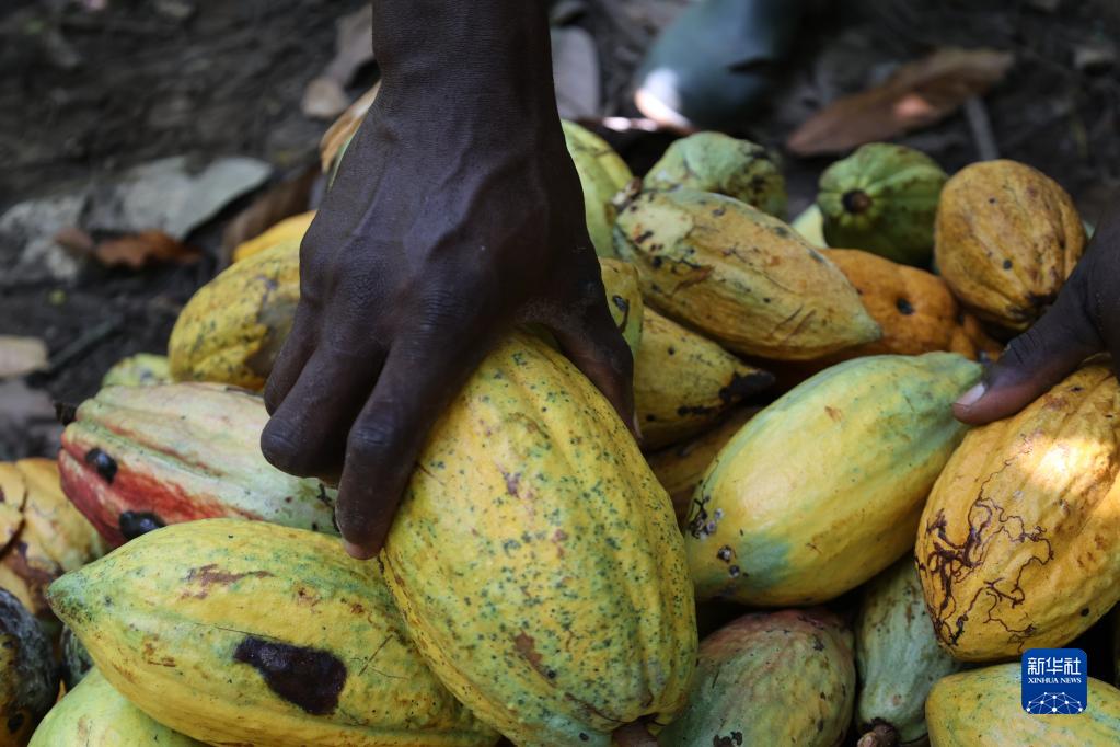 11月15日,在加納東部省的一處可可種植園,一名種植戶(hù)在整理可可果實(shí)。