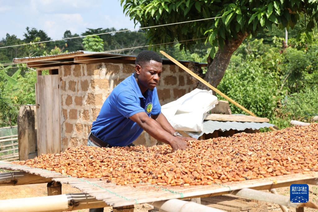 11月15日,在加納東部省的一處可可種植園,一名種植戶(hù)在晾曬可可豆。