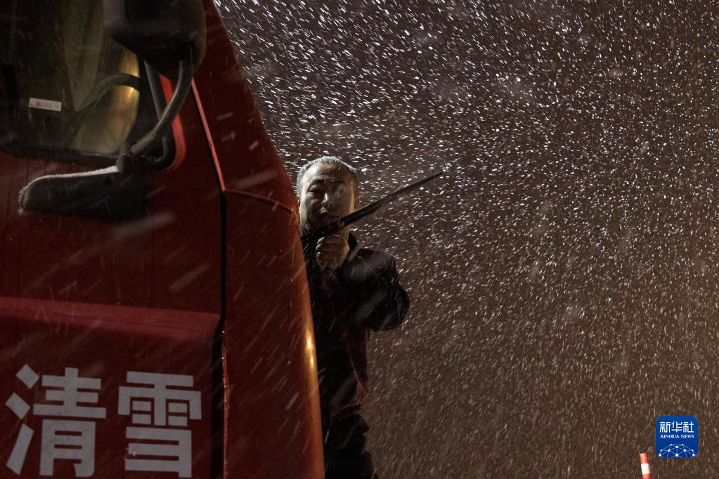 11月21日晚,清雪車(chē)司機在雞西市雞冠區雞東新路上對車(chē)輛進(jìn)行清理。
