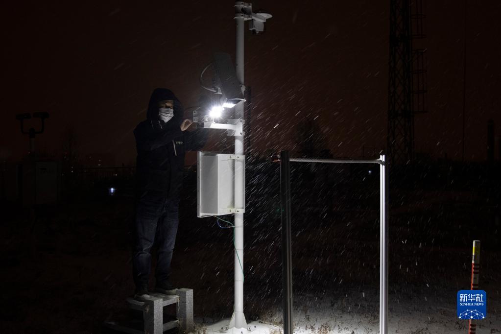 11月21日晚,在雞西市氣象局,工作人員在雪中巡查設備。