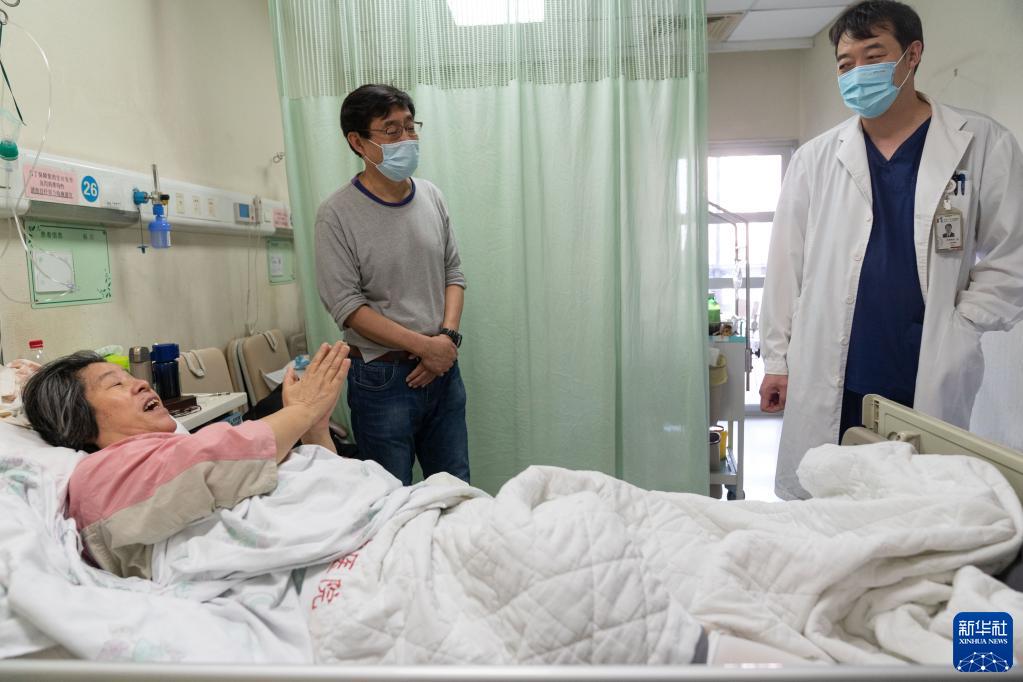 11月24日,在北京大學(xué)腫瘤醫院肝膽胰外一科病房,即將出院的沈建群(左)向主治醫師包全致謝。