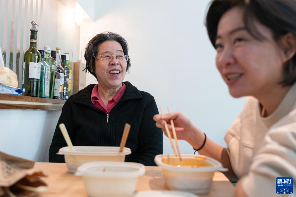 11月24日,剛剛出院的沈建群(左)在北京的住所內與女兒吳姝一起吃飯。