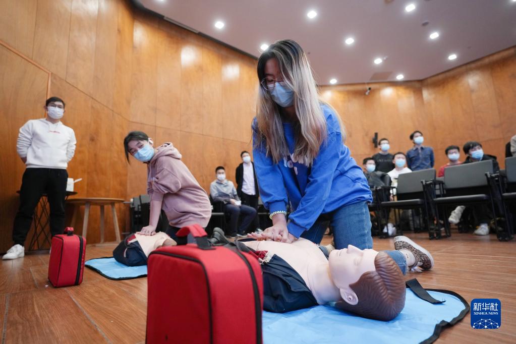 11月28日,清華大學(xué)計算機系的冬奧學(xué)生志愿者遆周杰(右)在急救技能培訓上學(xué)習心肺復蘇術(shù)。新華社記者 鞠煥宗 攝