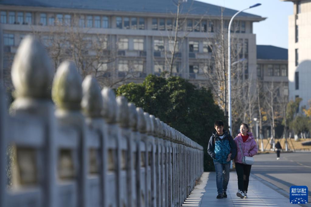 12月2日,唐聞澤和張晨(右)漫步在安慶師范大學(xué)的校園里。
