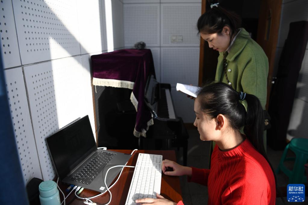 12月2日,在安慶師范大學(xué)音樂(lè )學(xué)院,張晨(前)與同學(xué)在琴房?jì)冉涣鳌?/p>