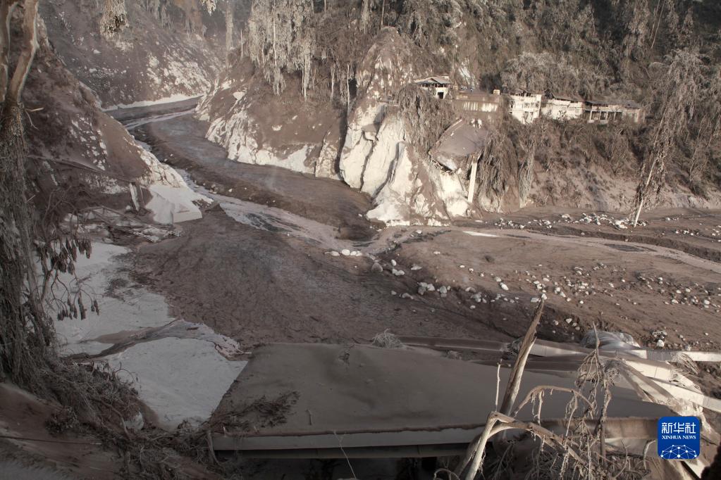這是12月5日在印度尼西亞爪哇島東部盧馬姜拍攝的被火山噴發(fā)物覆蓋的受損橋梁。
