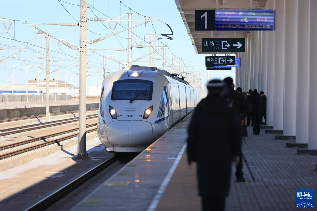 12月5日,動(dòng)車(chē)組列車(chē)駛入蘭新高鐵山丹馬場(chǎng)站。新華社發(fā)(王超 攝)