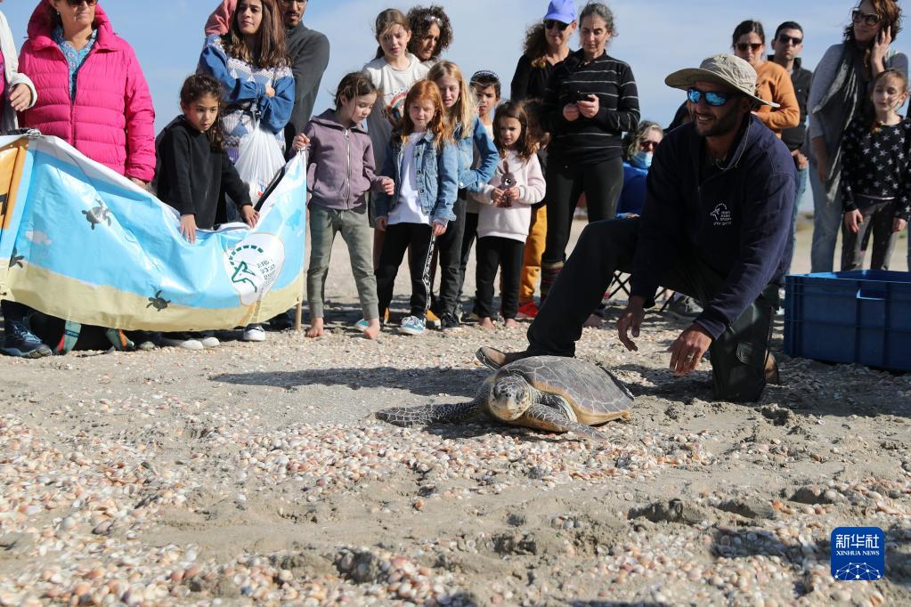 12月10日,在以色列北部城市海法附近的海灘,經(jīng)過(guò)以色列海龜救助組織治療后痊愈的海龜被放歸大海。