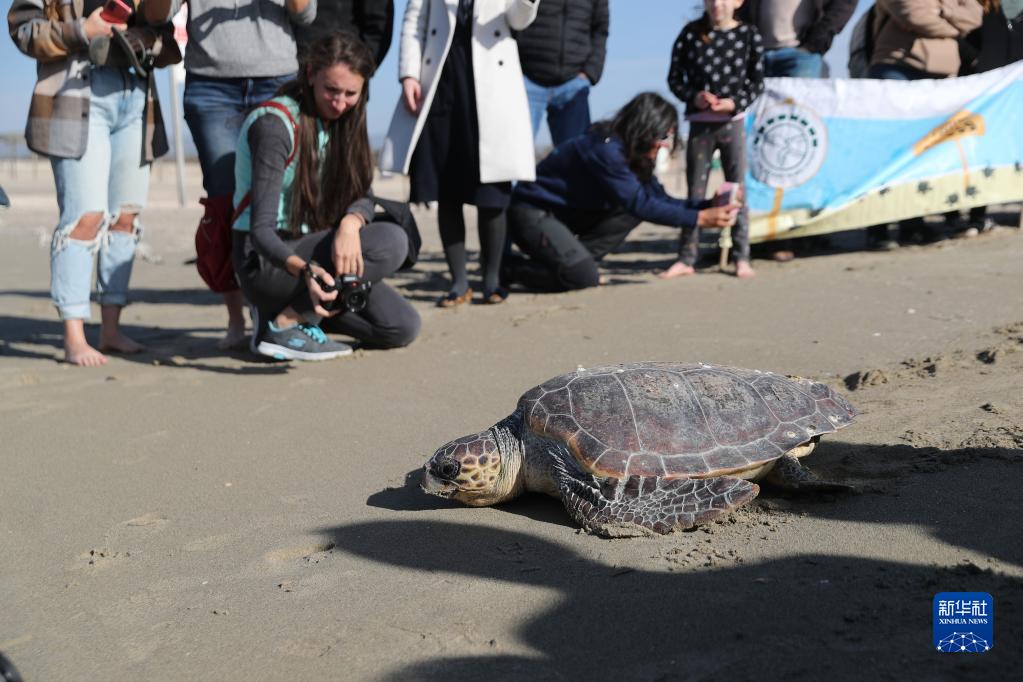 12月10日,在以色列北部城市海法附近的海灘,經(jīng)過(guò)以色列海龜救助組織治療后痊愈的海龜被放歸大海。