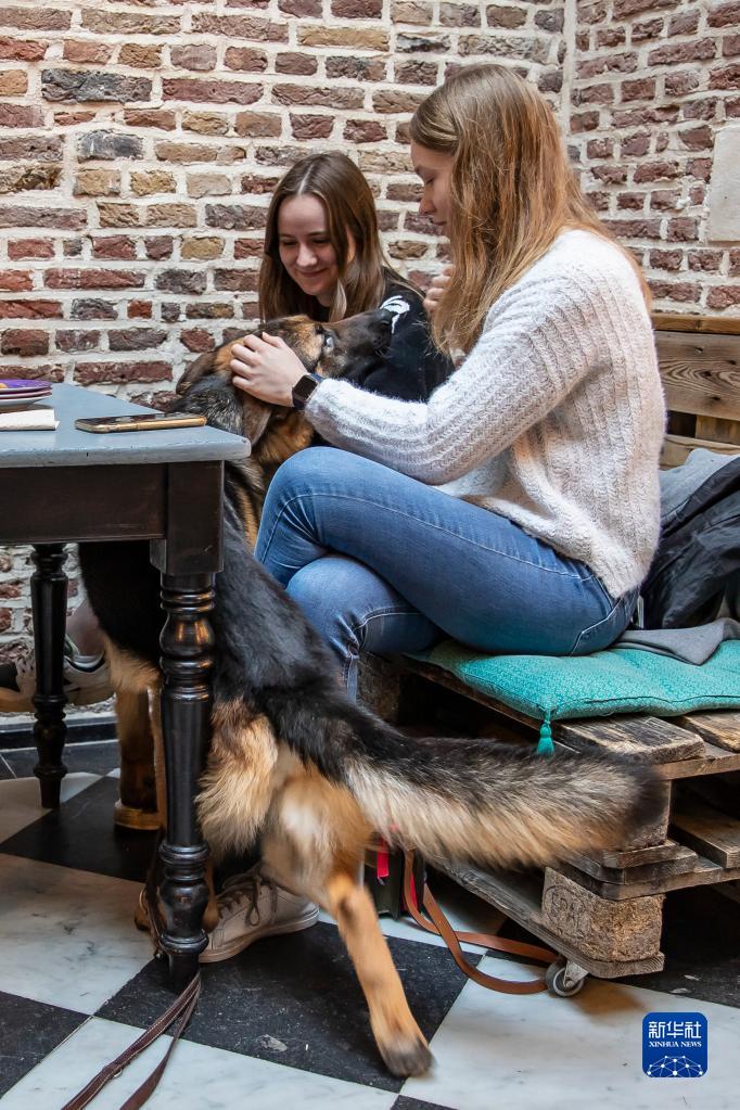 12月22日,在法國北部城市里爾名為Waf Cafe的咖啡館,顧客與狗狗互動(dòng)。