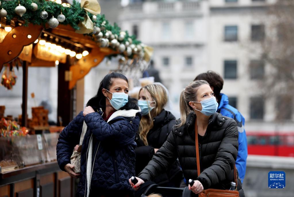 12月23日,在英國倫敦特拉法加廣場(chǎng)的圣誕市場(chǎng),人們佩戴口罩走過(guò)一家攤位。