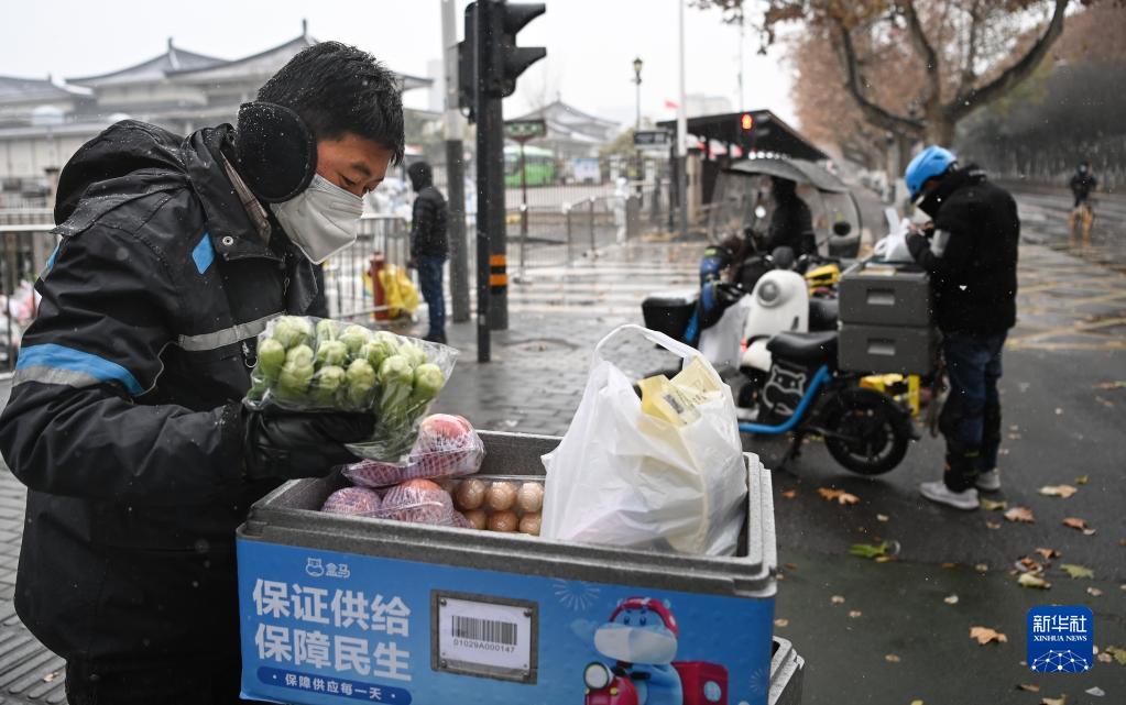 12月25日,外賣(mài)人員張欣(左一)在西安市小寨東路一封控小區配送蔬菜。這幾天,他的業(yè)務(wù)量是平時(shí)的兩倍。