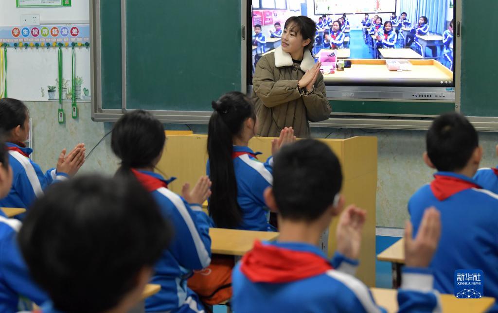 在江西省宜春市特殊教育學(xué)校聽(tīng)障班教室,樊海艷和學(xué)生們在課間休息時(shí)練習舞蹈動(dòng)作,這是樊海艷自創(chuàng )的課間操(12月28日攝)。