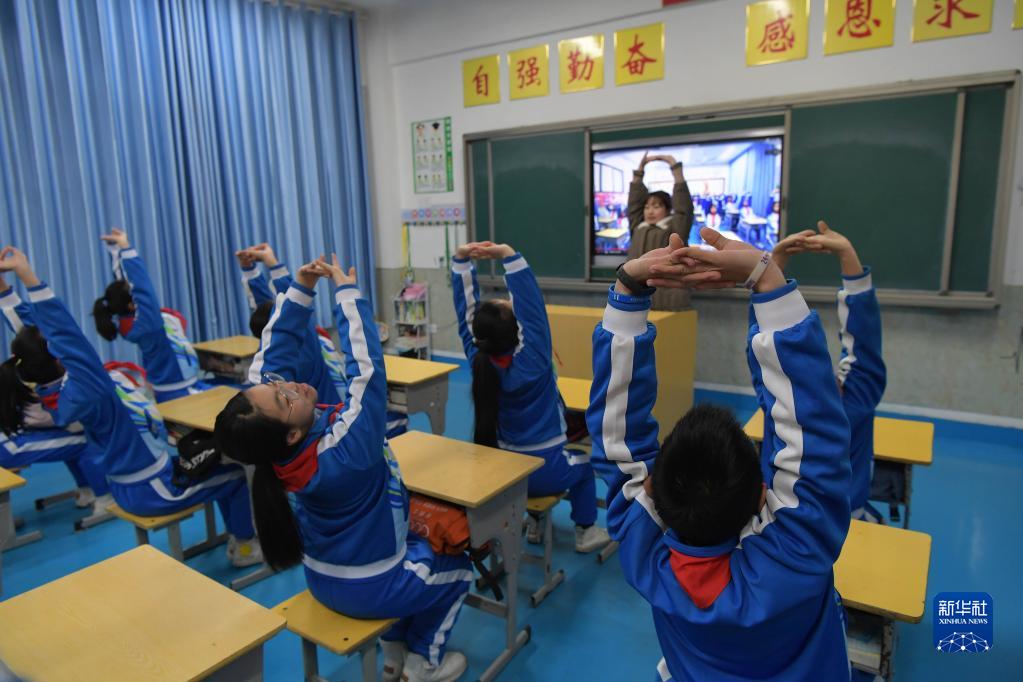 在江西省宜春市特殊教育學(xué)校聽(tīng)障班教室,樊海艷和學(xué)生們在課間休息時(shí)練習舞蹈動(dòng)作,這是樊海艷自創(chuàng )的課間操(12月28日攝)。