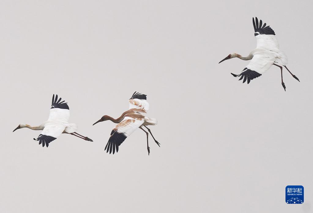 白鶴在濕地上空飛舞(1月1日攝)。新年伊始,在位于鄱陽(yáng)湖畔的南昌高新區鯉魚(yú)洲管理處五星白鶴保護小區里,來(lái)此越冬的國家一級保護鳥(niǎo)類(lèi)白鶴展翅起舞,姿態(tài)萬(wàn)千。新華社記者 萬(wàn)象 攝