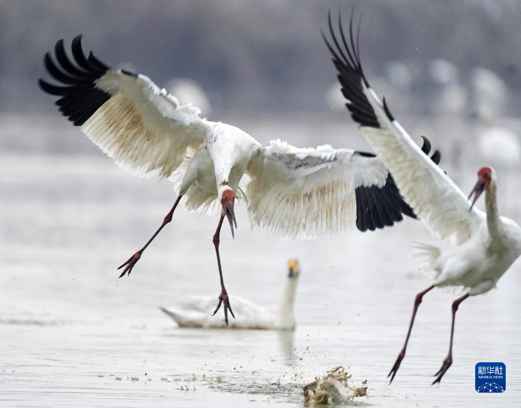 白鶴在濕地追逐嬉戲(1月1日攝)。新華社記者 萬(wàn)象 攝