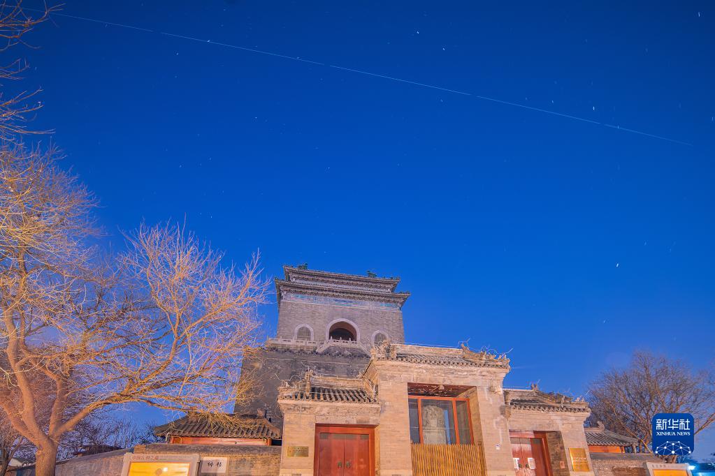 2021年12月14日,在北京市鐘鼓樓文化廣場(chǎng)拍攝的中國空間站過(guò)境照片(軌跡為多張照片堆棧)。