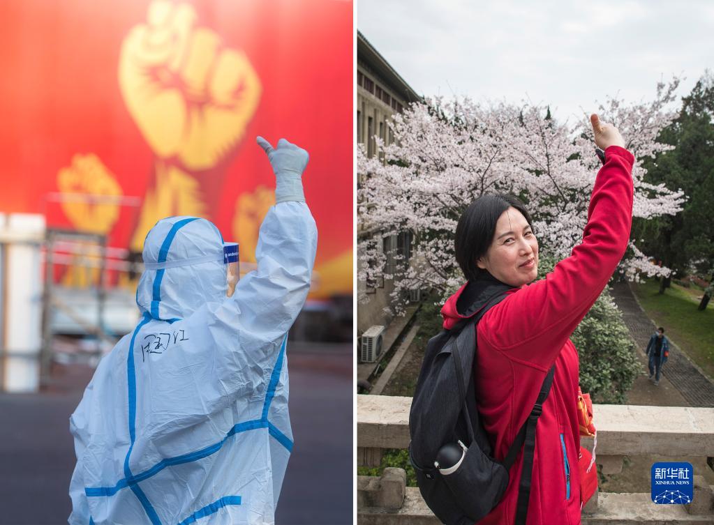 拼版照片:左圖為2020年2月12日,安徽援鄂醫療隊隊員周?chē)t在武漢體育中心方艙醫院前豎起拇指為自己和同伴加油;右圖為2021年3月13日,周?chē)t參加武漢大學(xué)援鄂抗疫醫護人員賞櫻專(zhuān)場(chǎng),在櫻花樹(shù)前拍照留念。